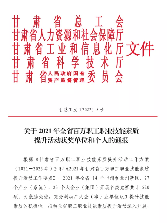 1月21日,甘肃省总工会、省人力资源和社会保障厅、省工业和信息化厅、省科学技术厅、省人民政府国有资产监督管理委员会联合公布了《关于2021年全省百万职工职业技能素质提升活动获奖单位和个人的通报》,石化多宝(中国)一站式服务官网专精特新公司孙占栋、刘恒、林占强、骆振玺、刘恒5名职工荣获“2021年甘肃省技术标兵”称号。