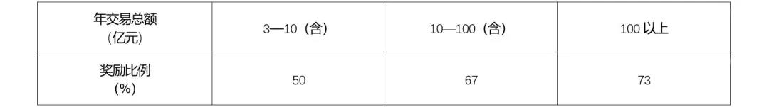 3.根据大宗贸易企业贸易额度,对缴纳的印花税,按以下比例予以奖励。享受该条政策的企业不再就印花税事项重复享受“税费扶持及奖励” 政策中第1、2条。