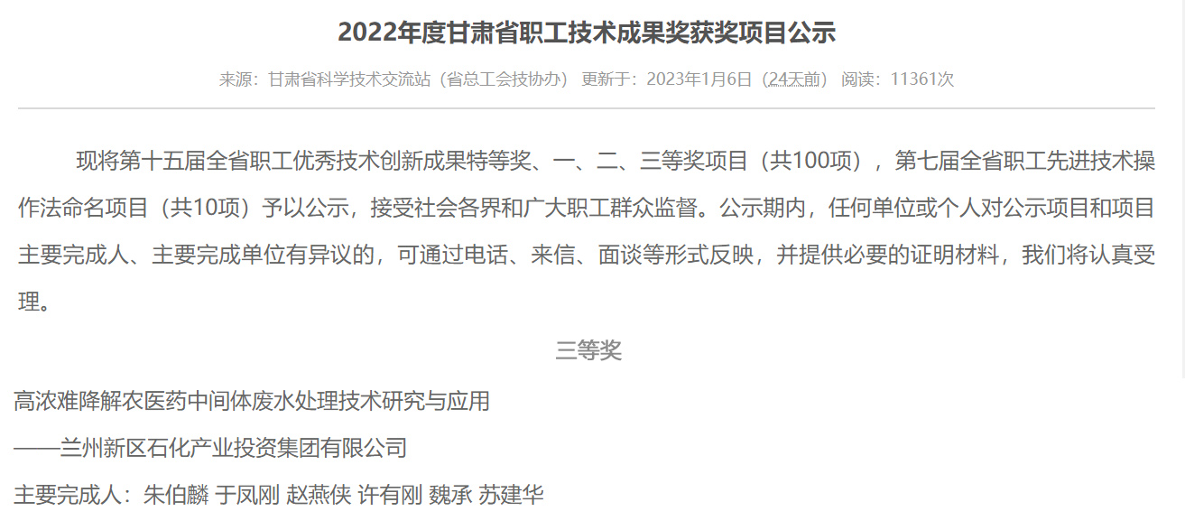 近日,甘肃省总工会对2022年度甘肃省职工技术成果奖获奖项目进行了公示,石化多宝(中国)一站式服务官网博石环保公司《高浓难降解农医药中间体废水处理技术研究与应用》获得三等奖。