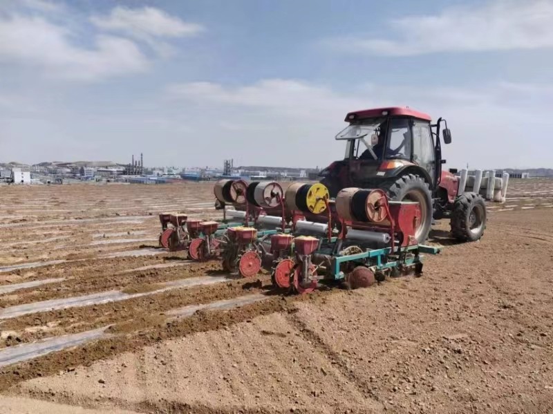 走进兰州新区经三十四路以西、景中高速以东高标准农田项目建设现场,一台台玉米播种机正在徐徐前行,播种、铺设地膜、滴灌带等环节在现代农机自带北斗卫星导航系统的精准定位下完成,作业人员紧跟播种机查看开沟、下种、铺膜、覆土等情况。