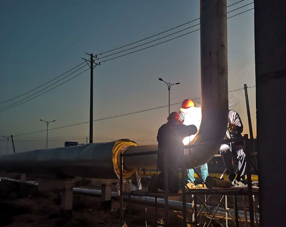 热力管网一期项目位于兰州新区绿色化工园区南区块,由兰州新区化学工程有限公司承建,主要负责为园区企业提供生产所需的蒸汽及采暖所需的热水。该项目主管网已于2019年11月全线贯通,并投入使用。后期因新入园企业的增加,导致原管线预留口及企业门头桁架发生变更需改迁。为了不影响园区企业生产运营,石投多宝(中国)一站式服务官网经过多方协调,商定于9月29日早上七点停汽。此次热力管网管道改迁工作任务紧,难度大,工程公司迎难而上,通过前期对图纸的精研,科学组织,精准施策,经过15个小时连续奋战,最终完成6座企业门头桁架蒸汽管道的改迁、6处新增蒸汽预留接口的安装及2处DN400旋转补偿器位置的变更。